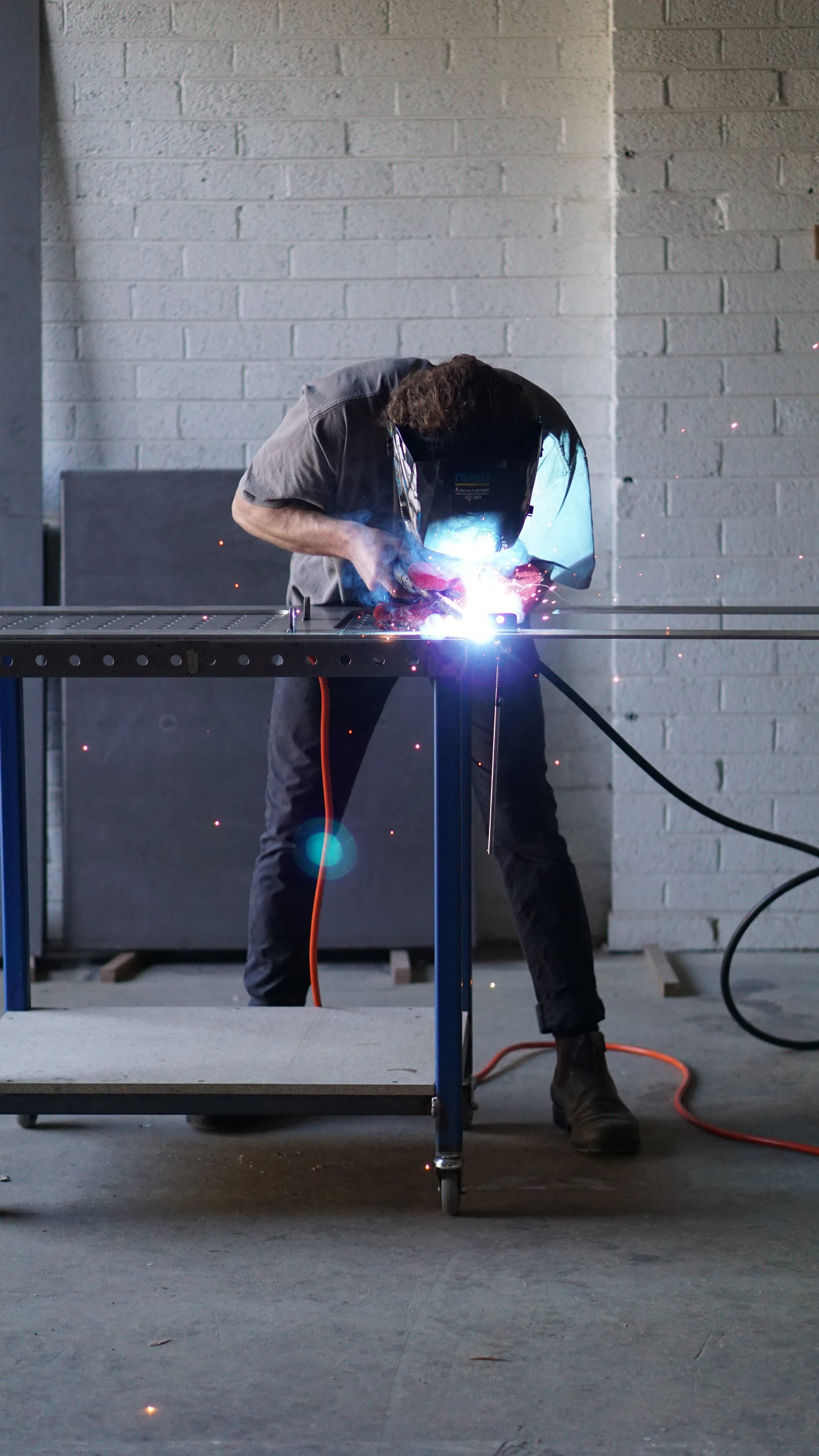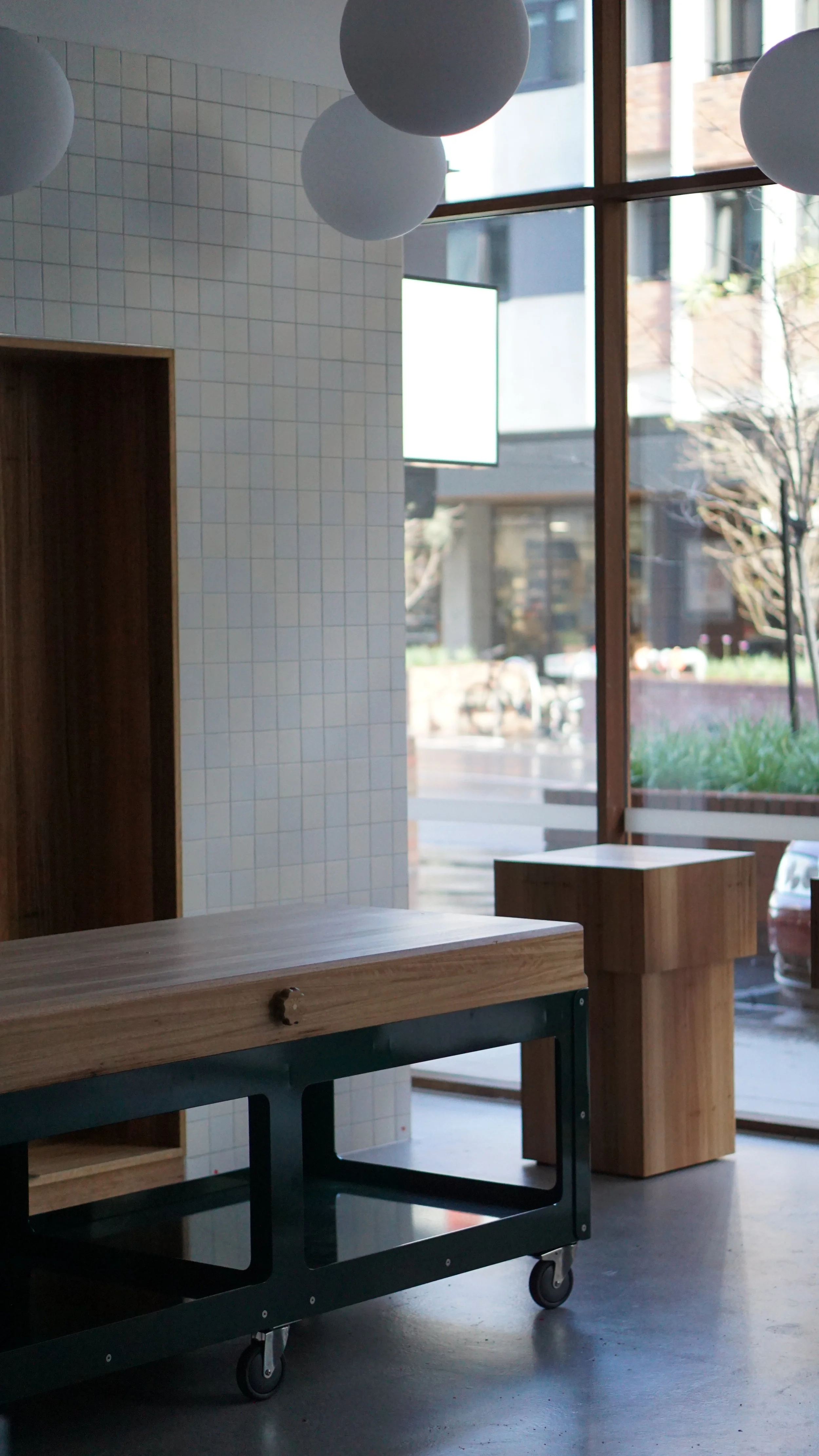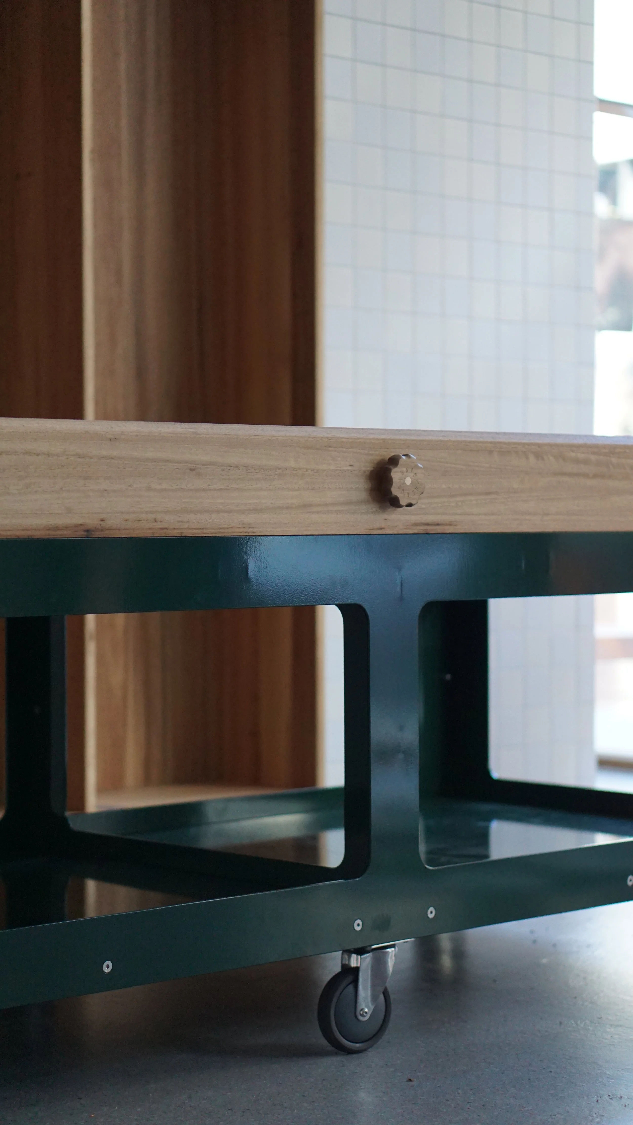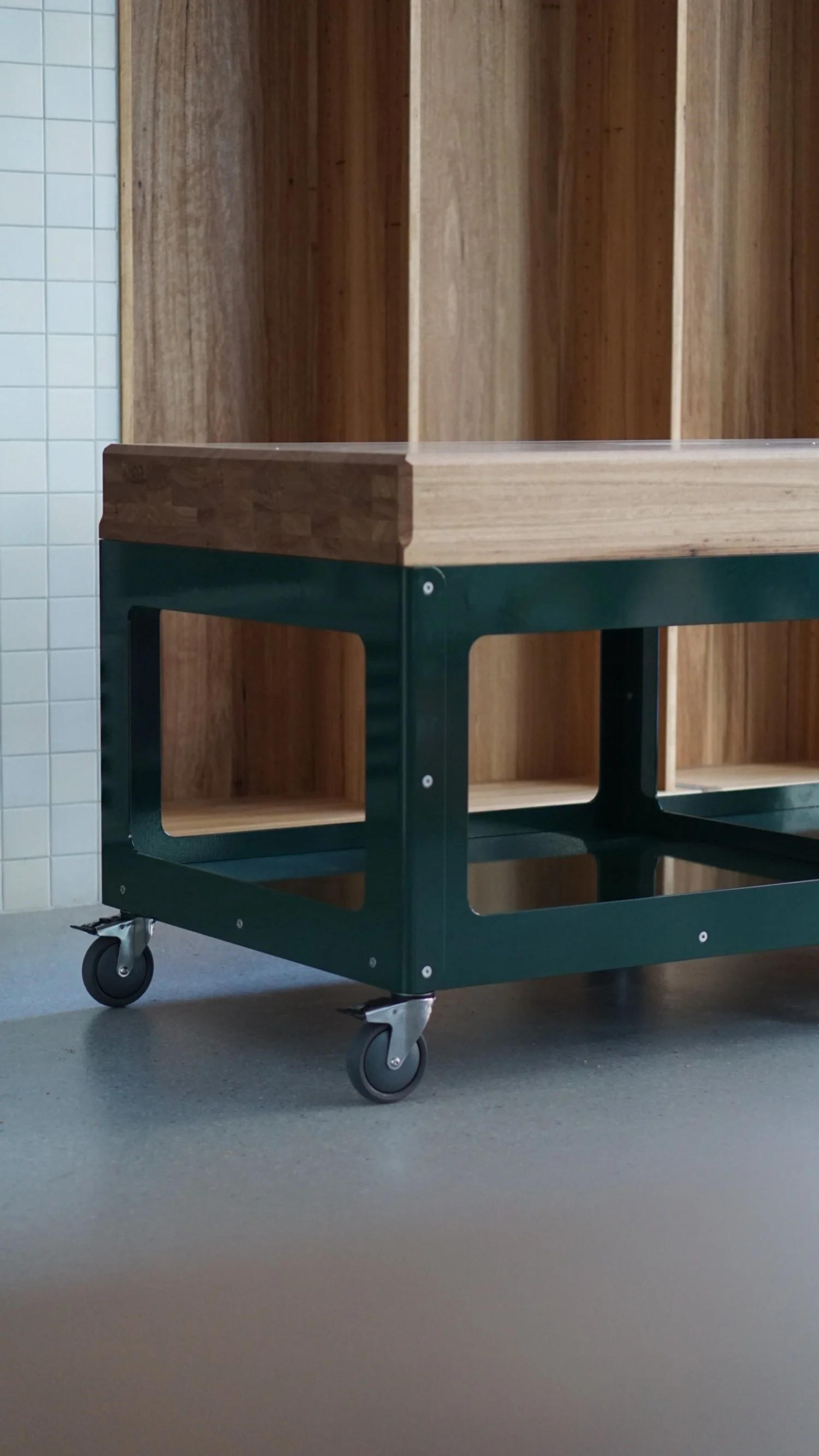 A custom display bench for a new organic Butcher’s shop in East Brunswick Village. Top crafted using Blackbutt timber with end grain ends to reflect a butcher’s block. Laser cut steel frame base powdercoated in Dulux Deep Brunswick Green on lockable castor wheels.