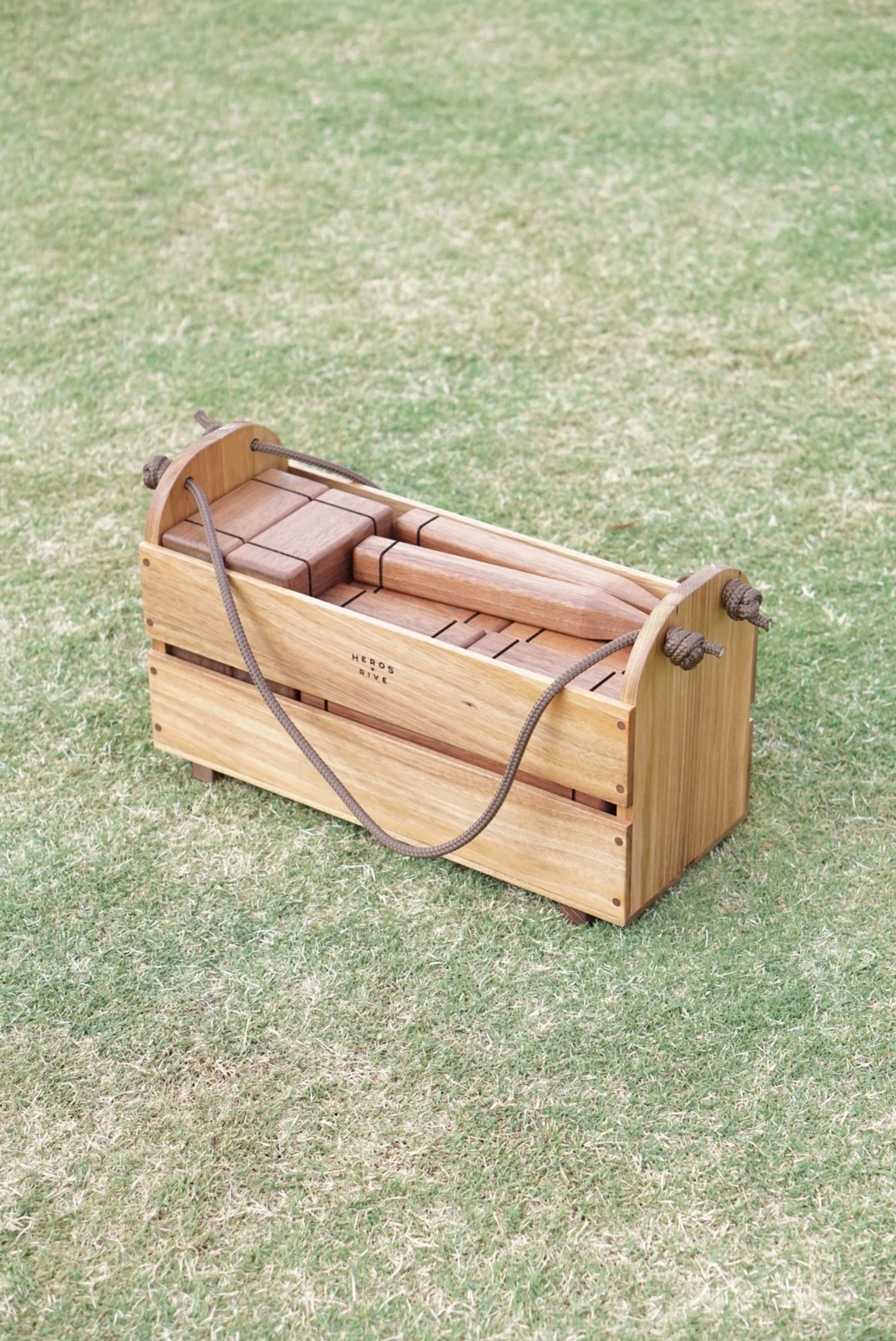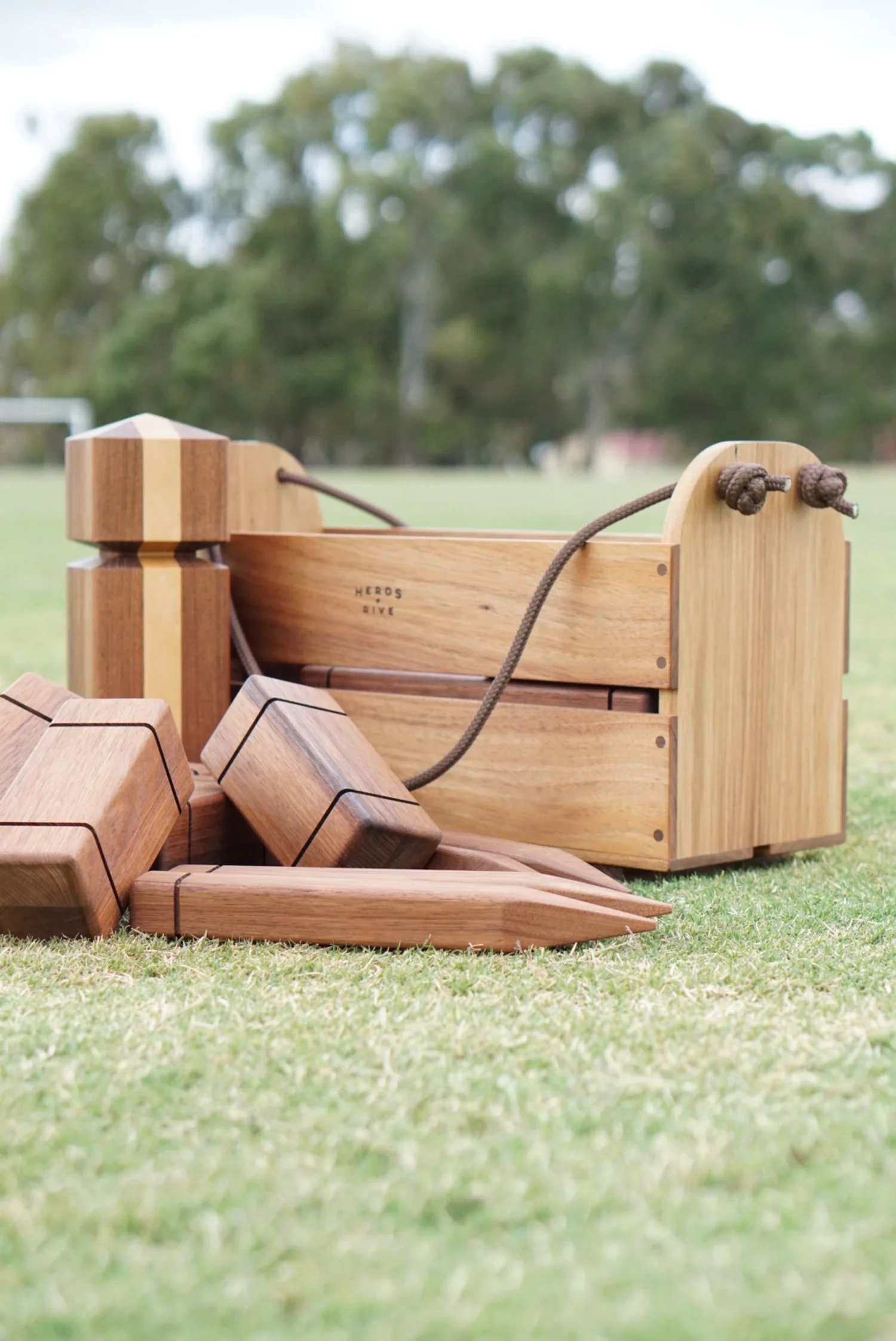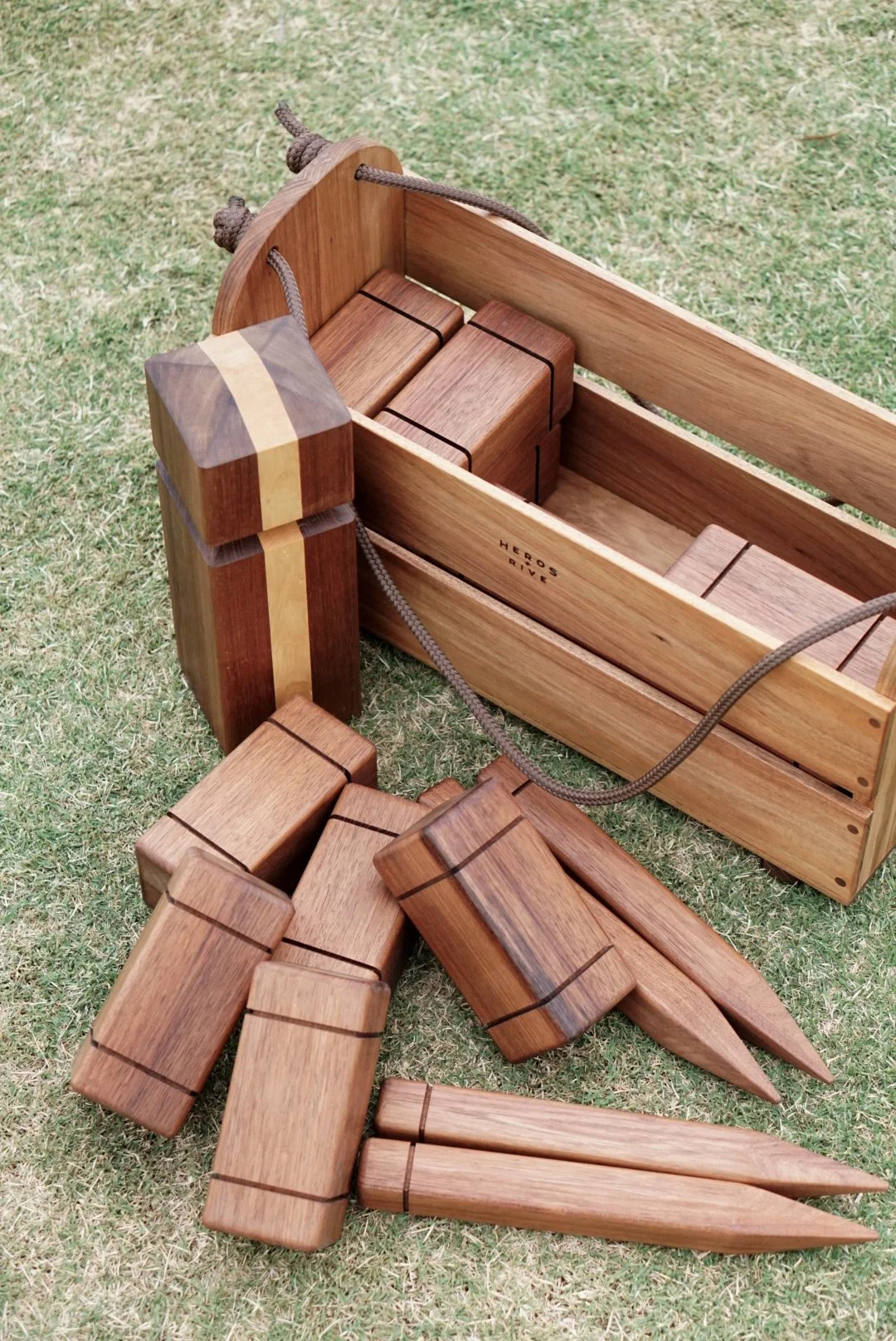 A kubb set made for a Heros + Rive giveaway. Made with Tasmanian Blackwood and a Celery Top Pine feature strip to the King piece. In a matching Blackwood crate with yachting braid handles.